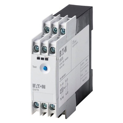 Eaton EMT6 thermistor overload relays offer reliable motor protection by monitoring temperature with high accuracy through direct thermistor sensing. These compact, DIN rail-mountable relays are ideal for safeguarding motors and transformers from overheating caused by overload, blocked ventilation, or high ambient temperatures.