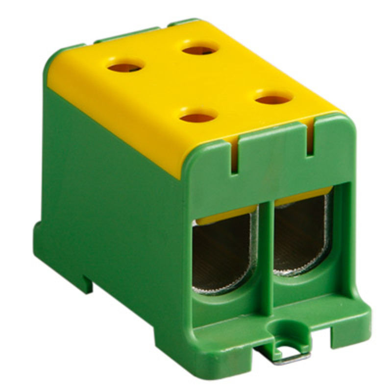 150mm Green/Yellow DIN Rail Terminal for TS35 Rail or Base Mounting; Four linked Connections; Suitable for Copper & Aluminium Cable