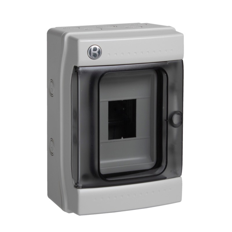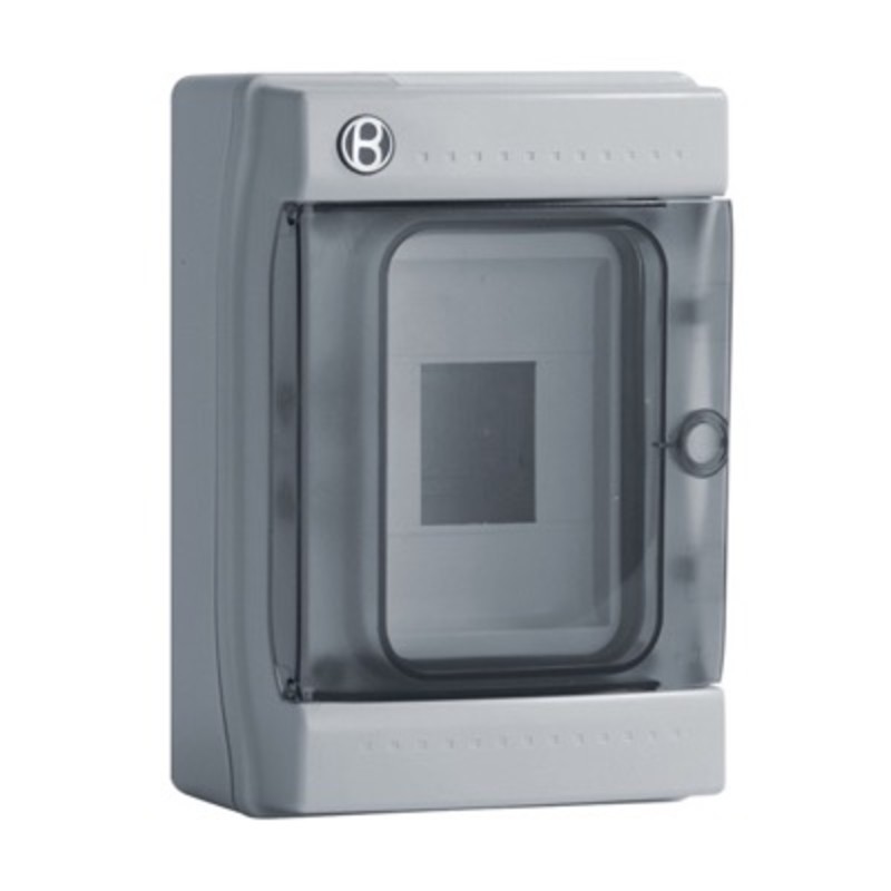 PABLO 4 Module Distribution Enclosure; 1 Row; 4 Modules; IP65; Base: RAL7035 Door: Transparent Grey; 210mmH x 143mmW x 102mmD; Complete with Earth Block; with Knock-outs; B06534