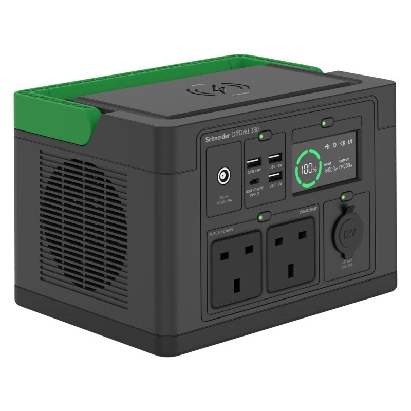 Schneider OffGrid Portable Power Station 330; 230V; 332Wh Lithium-ion; LCD, 2 BS1363 UK Outlets; Sinewave; 3 USB-A; 1 USB-C; Wireless Charger