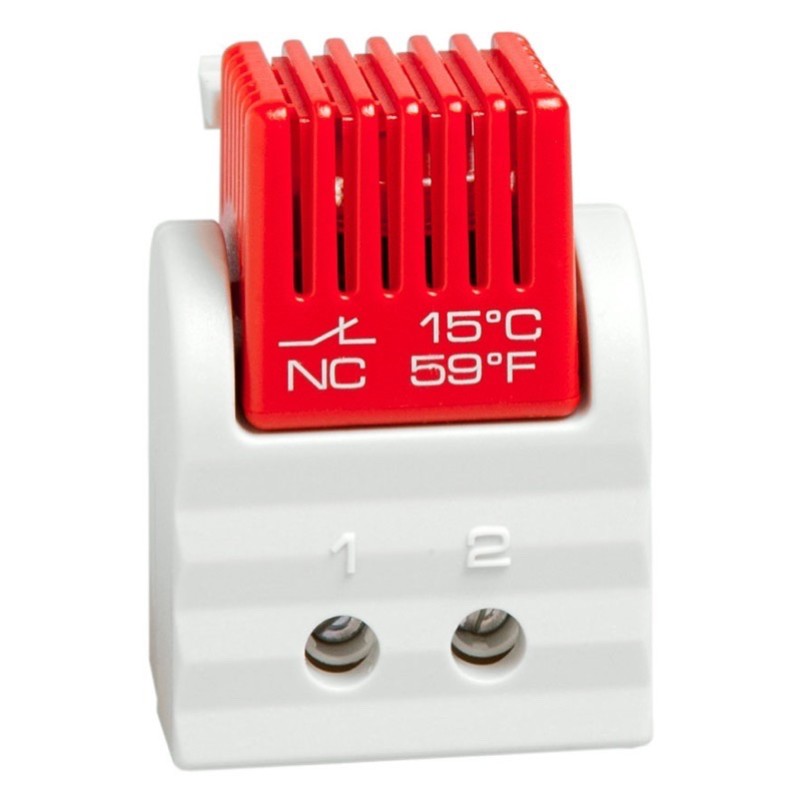 Tamper-proof thermostat for regulating heaters or for switching signal devices when temperature has fallen below the minimum value. The contact opens when temperature is rising. In-built DIN Rail clip Dimensions: 47mmH x 33mmW x 33mmD
