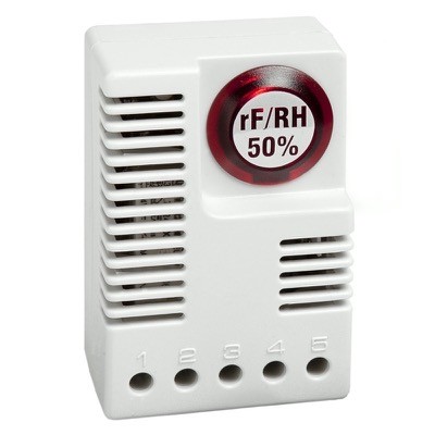 The electronic hygrostat senses the relative humidity in an enclosure with electric/electronic components and turns on a heater at the set point, helping prevent the formation of condensation in the enclosure. The LED integrated in the adjustment knob is lit when the connected heater is in operation.