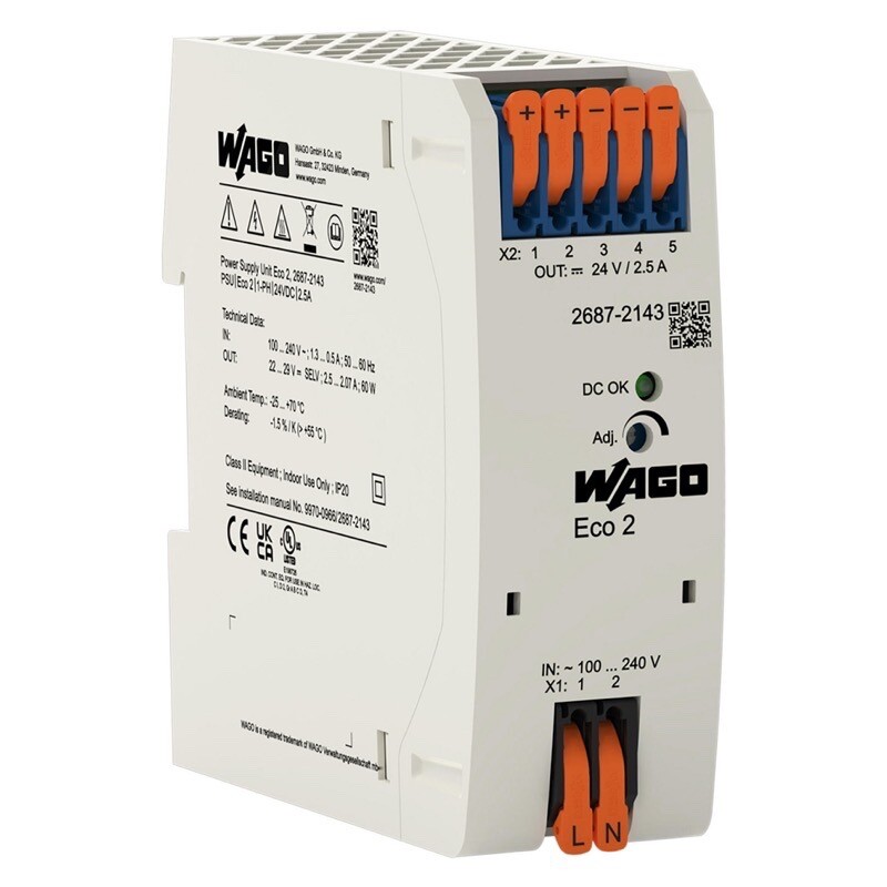 2687-2143 - WAGO Eco 2 Power Supply 1-Phase 24V DC Output Voltage 2.5A Output Current Input Voltage 90-264V AC DC-OK LED