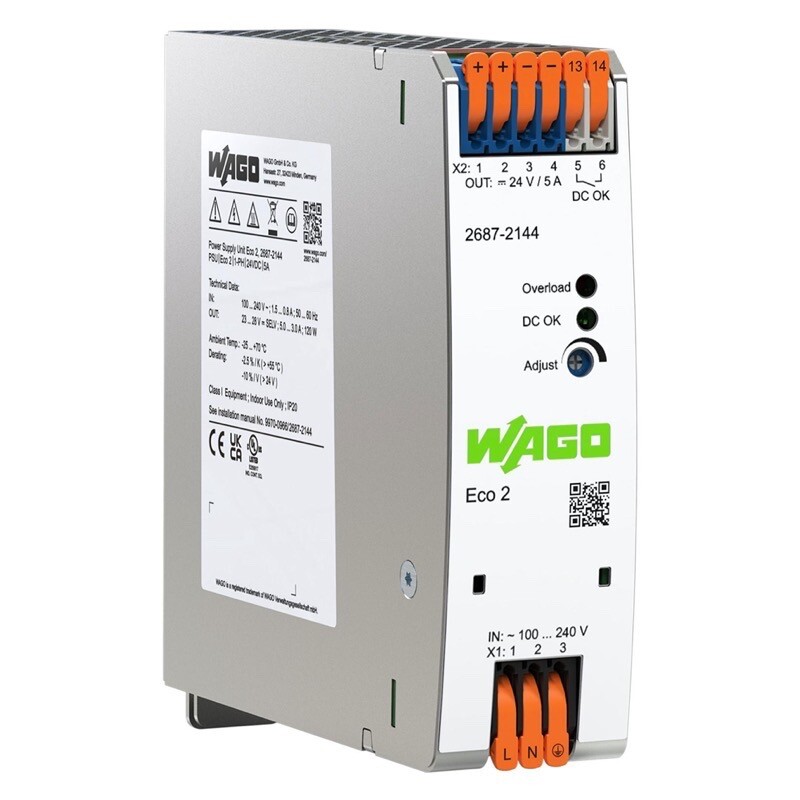 2687-2144 - WAGO Eco 2 Power Supply 1-Phase 24V DC Output Voltage 5A Output Current Input Voltage 90-264V AC DC-OK LED