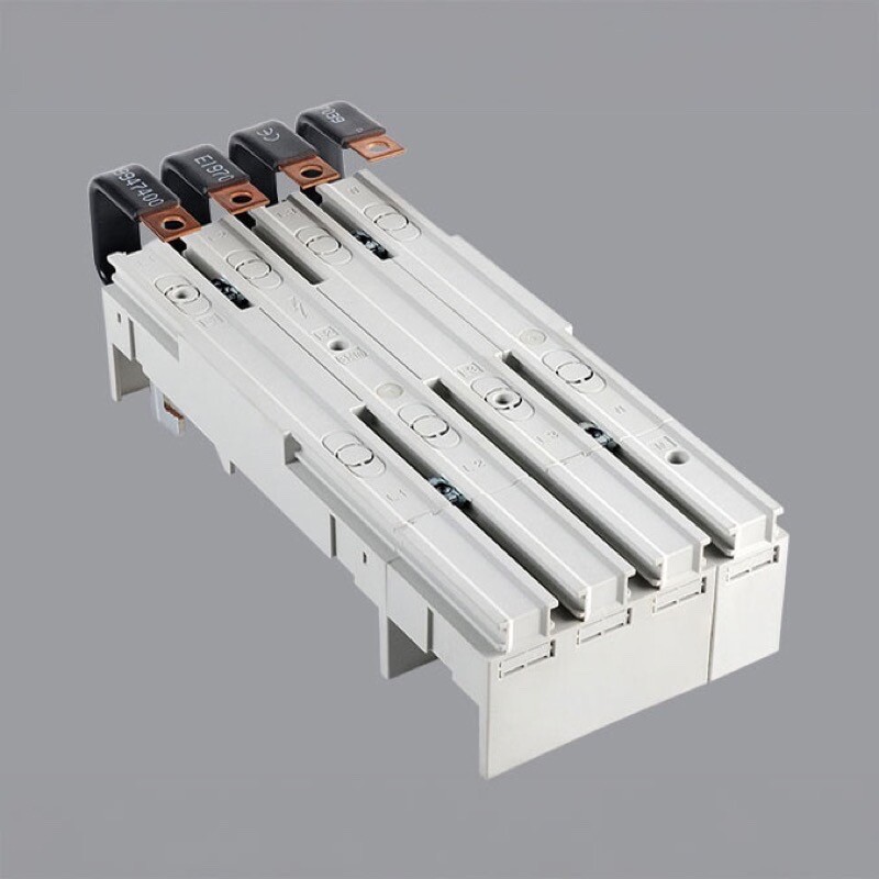 Wohner EQUES Busbar Adapter 160A 4-pole with Laminated Copper (Top) 100 x 260; Phase Spacing 25mm N Right; Connection to the System Above for ABB T1, XT1 / Schneider Electric NSXm160 / Siemens 3VA10, 3VA11 for busbars 12, 15, 20, 25, 30 x 5, 10 and Profile Rails