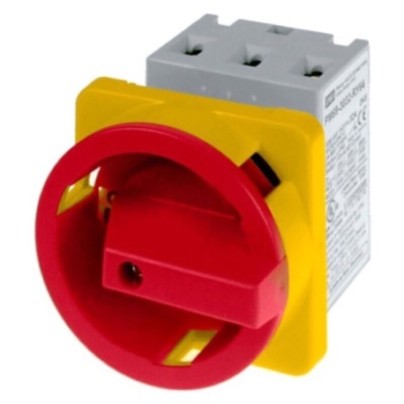 100A 3 Pole Isolator for Door Mounting; Switch supplied with IP66 Red/Yellow handle - 64mm x 64mm